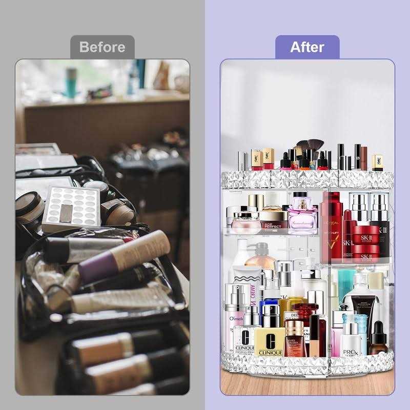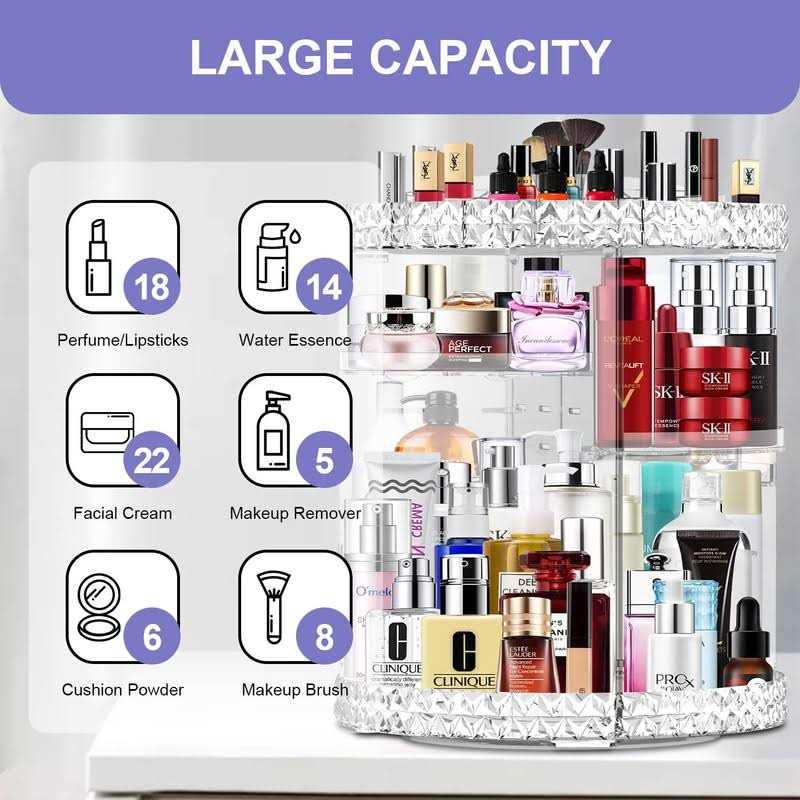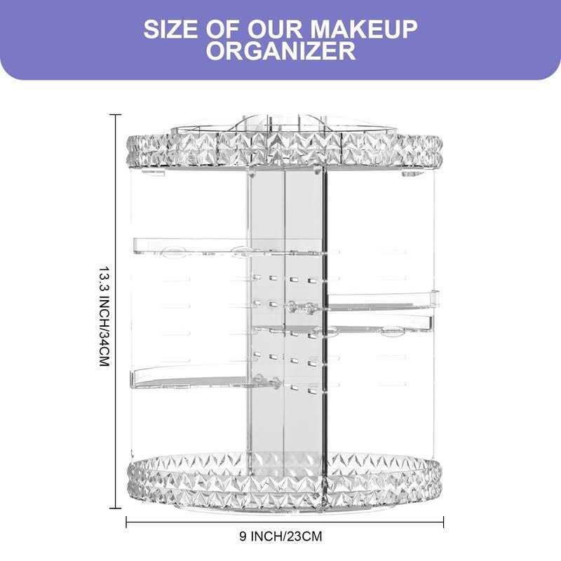 360 DEGREE ROTATING: 360 degree smooth rotationstore your entire makeup routine in one place and help you find cosmetics easily. LARGE CAPACITY:it help you save space on your dresser.it can hold lipsticks blushes eye shadows primers powders and manicure tools or toiletries like facial scrubs and so on. EASY TO INSTALL & CLEAN: the makeup organizer is easy to assemble and wipe clean as needed.Because its transparent its easy to spot stains. Its just a matter of rinsing with water and brushing with a brush. FOR ANY OCCASIONS:A bedroom bathroom closet kitchen dresser or countertop are all great places to put it.its also the best gifts to the family like your mother or lovers and so on . CHIC DIAMOND DESIGN:It has a unique design on the top and bottom and the diamond-like pattern adds a different aesthetic feeling to it. But dont worry its safe and abrasion resistant.