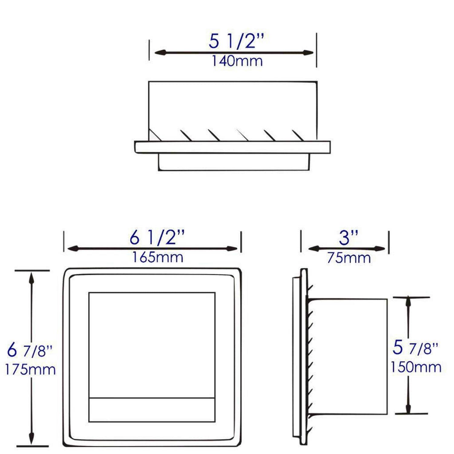 - Installs into the wall between the studs for a neat, recessed appearance. The wall cut out dimensions are 6″ x 6″.