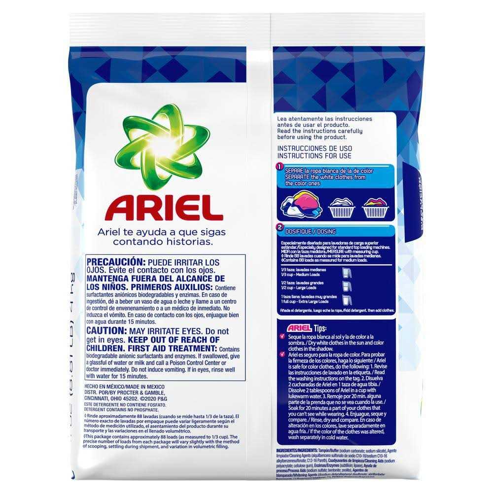 Remove stubborn stains from clothes without damaging them with the Original Laundry Detergent Powder from Ariel. This detergent powder cleans deep down into the fiber to not only remove tough stains but also prevent them from setting in. Formulated for washing white clothes, this laundry powder is 100% safe for colored clothes as well and doesn’t strip them of their original color. Plus, its great smell lingers on clothes to make you feel fresh and active. Ariel Powder Laundry Detergent is economical and effective for your laundry needs. Add detergent before adding clothes into your washing machine for the best results. For mediums loads use 1/3 cup of detergent, for large loads use 1/2 cup of detergent and for extra-large loads use 1 full cup of detergent. Avoid applying detergent directly to your clothes prior to washing.