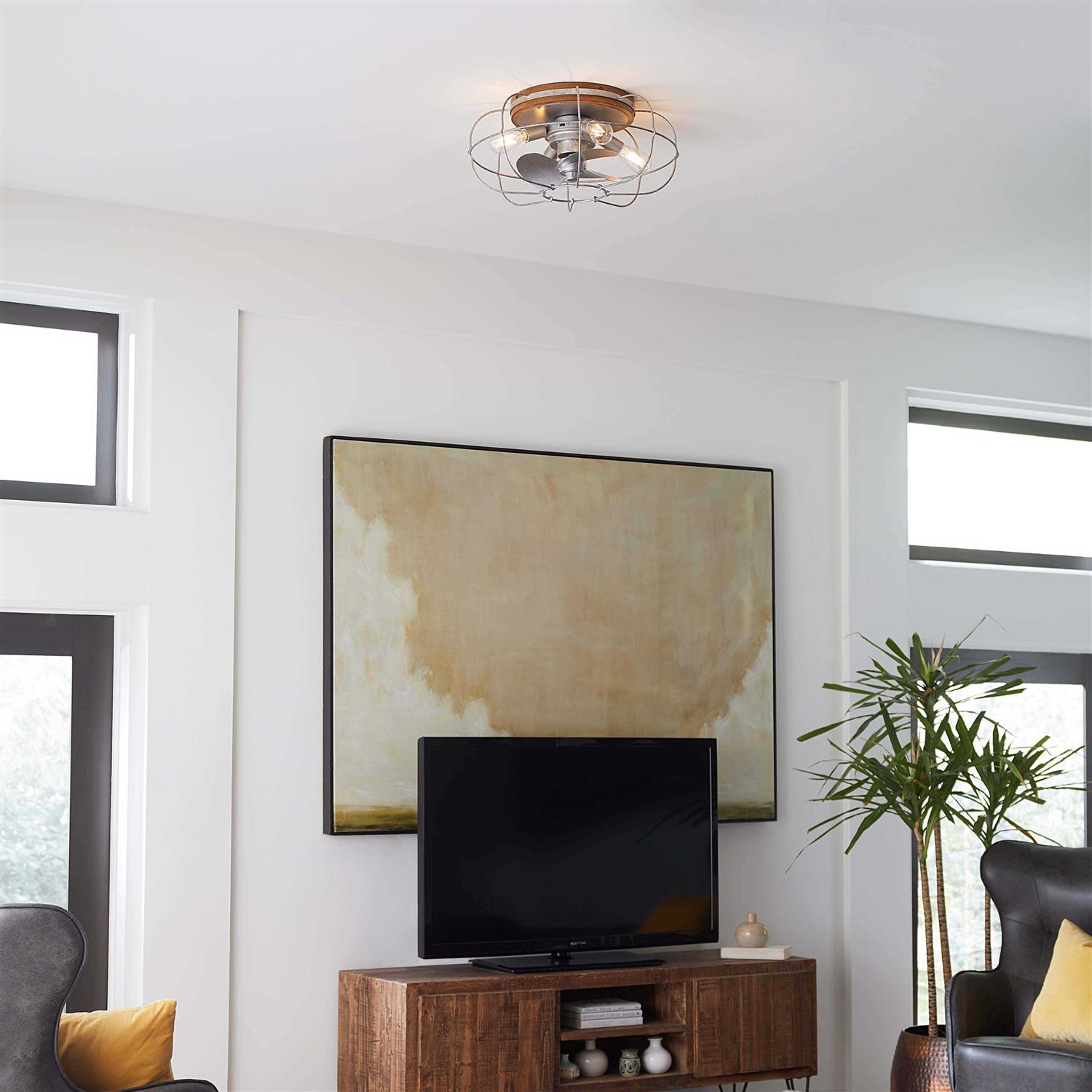 The Jaxon Ceiling Fan is totally unique in the world of ceiling fans because it mounts flush to the ceiling. That makes this fan is ideal for use in rooms with lower ceilings. The Jaxon Ceiling Fan in Galvanized finish adds a classy look, and a cooling breeze to any room. The painted faux woodgrain accent adds a touch warmth to the rustic galvanized painted steel cage. This fan with lights is very versatile, and is ideal for use in medium to small sized rooms, like bedrooms, bathrooms, kitchens, laundry rooms, dens, and offices.