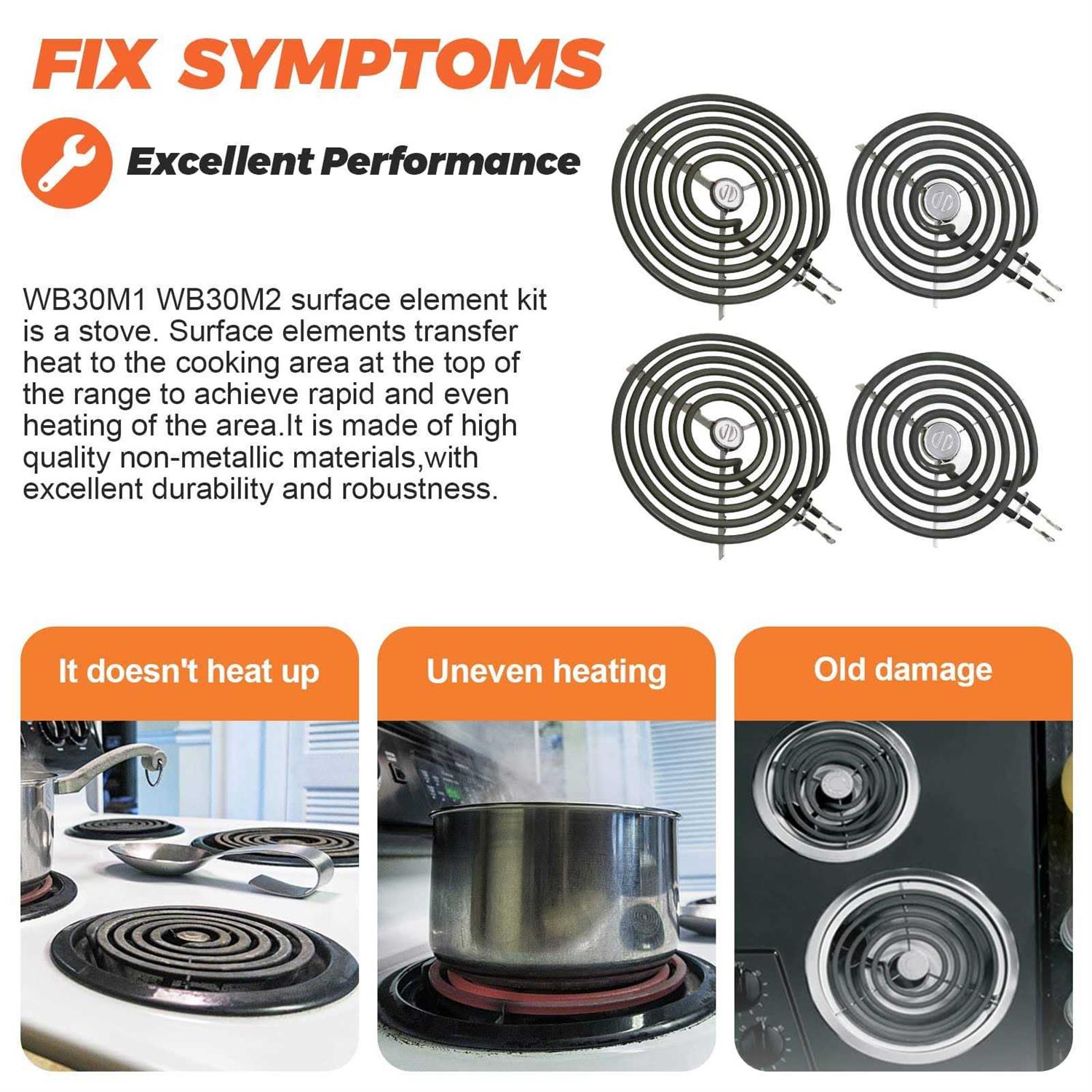 Burners by Beaquicy. Details:PRODUCT DESCRIPTION: A surface burner element generates much-needed heat on your electric range. When it burns out, you lose a burner, which can make cooking dinner difficult. Thankfully, replacing a shorted out surface burner element takes only one minute to do. No tools required either. The Beaquicy electric range element directly replaces part number WB30M1and WB30M2 PACKAGE INCLUDE: 2 Pcs*WB30M1 6 Inch Surface Element 2 Pcs*WB30M2 8 Inch Surface Element EASY TO INSTALL Installation Tips: The surface burner elements, those metal components that get red-hot and generate heat, are the most important parts of any range. When the elements fail to heat properly, it’s time to replace them. It’s a simple procedure any electric stove owner can easily accomplish in a few minutes’ time. You can usually identify a burnt-out element by blistering or small holes on the element’s coils. A burner that plugs into a receptacle is easy to test, just unplug the…