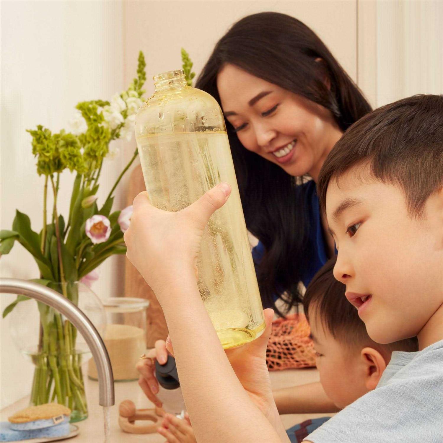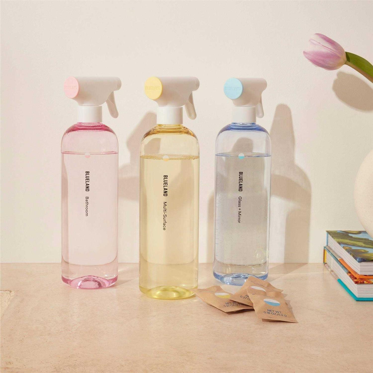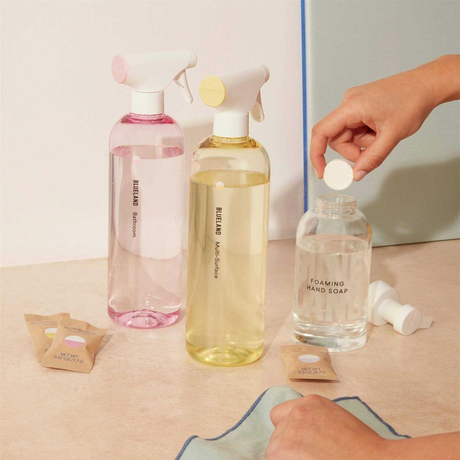 The Clean Essentials Kit – includes Multi-Surface, Bathroom, Glass & Mirror cleaning sprays and foaming hand soap. Make the swap to more sustainable cleaning supplies. Three reusable and refillable shatterproof spray bottles and one glass hand soap bottle paired with Blueland’s eco-friendly cleaning tablet refills. Safely and effectively removes mold, mildew, watermarks, grime, grease and soap scum with clean ingredients. Hand soap gently cleans hands without stripping or drying.