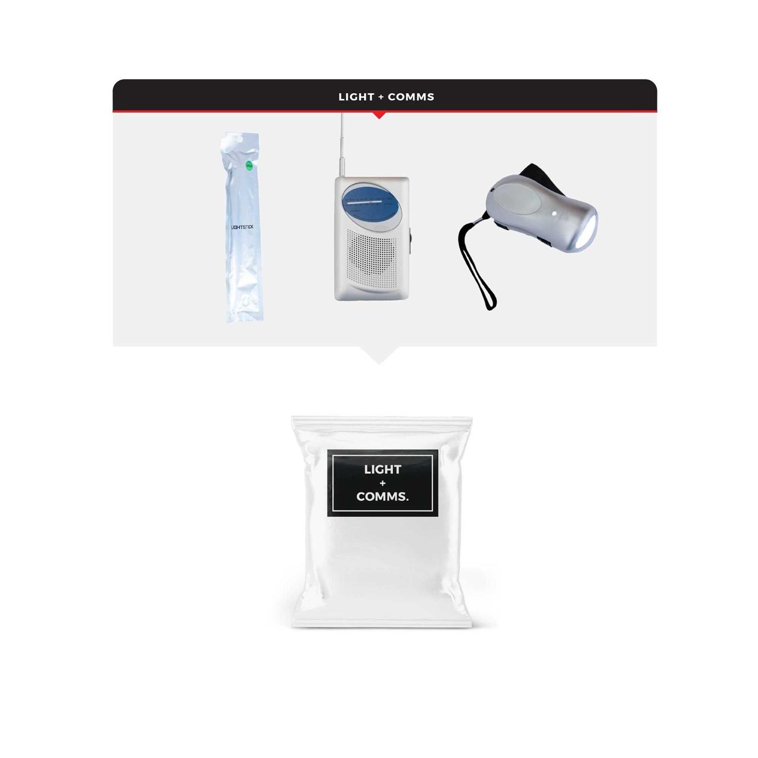 This kit includes the following: Food and Water: The food and water in this kit have a 5-year shelf life, and are meant to provide nutrition for 72 hours. (12) 4 oz. Water Pouches (9) 400-Calorie Food Bars (10) Water Purification Tablets – each tablet purifies 1 liter of water (1) 1-Liter Hydration Bags with Straw Tools and First Aid: These tools can be useful when you need help with navigation, transport, personal protection, or shelter. A first aid kit can be used to treat minor injuries and protect against more serious health threats in a disaster. (1) Small Bandage Kit (3) Alcohol cleansing pads (1) Butterfly closure (10) Cotton tip applicators (2) Gauze pads (10) Plastic bandages (3/4” x 3”) (10) Plastic bandages (3/8” x 1 1/2”) (1) Reusable case (1) 5 in 1 Emergency Whistle (1) Coloring Book with Crayons (1) Toy Set Light and Communication: These items can come in handy if you experience a home power outage, car trouble, or other emergencies. (1) AM/FM Radio (batteries included) (1) Emergency Bright Stick (1) Hand Rechargeable Flashlight (never needs batteries) Shelter and Warmth: These supplies will protect you from wind, sun, rain, and other harsh conditions. (1) Emergency Blanket (1) Fleece Blanket (1) Emergency Poncho (1) Hand/Body Warmer (1) Pair of Warm Gloves Hygiene and Sanitation: Hygiene is important in a disaster; staying clean can protect against infection, disease, and depression. (1) Deluxe Hygiene Kit (1) 0.25 oz. Hand and Body Lotion (1) 0.34 oz. Shampoo and Conditioner (1) Bar of soap (1) Comb (1) Deodorant Gel (3) Maxi Pads (1) Pocket Tissue Pack (1) Shaving Cream Packet (1) Toothbrush (1) Toothpaste (1) Toothpick (1) Twin Blade Razor (1) Washcloth (3) Wet Wipes (3) Disposable Face Masks Emergency Survival Kit Information: This kit was designed using advice from experts in the field of emergency preparedness. It follows guidelines offered by government agencies and nonprofit preparedness organizations.