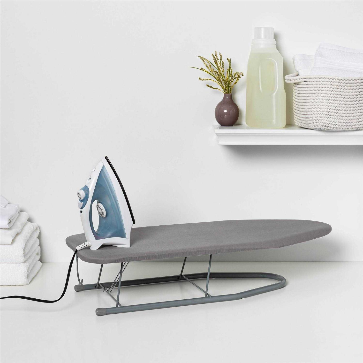 Description Conveniently iron your clothes with the Tabletop Ironing Board from Room Essentials. This tabletop ironing board features a metal mesh ironing design with a padded cover to offer you a smooth ironing surface, and it’s balanced on a metal frame to ensure less slipping or sliding while ironing. Featuring a foldable design for easy storage, it also has a loop at the back for hanging from a hook behind the door or in the closet for space-efficient storage.