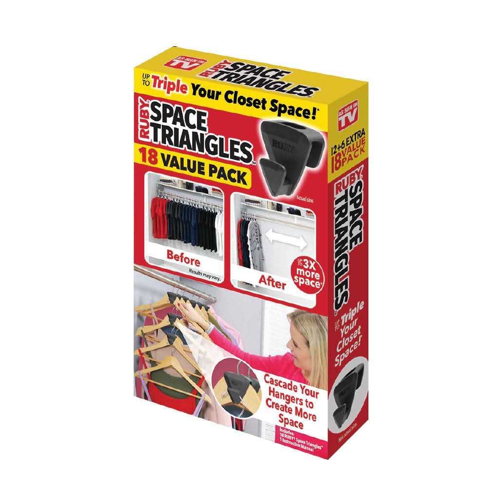 RUBY Space Triangles are the clever hanging device that fits over most hangers to save you wardrobe space in seconds. Your wardrobe can go from messy to marvellous in no time. Just place RUBY Space Triangles on each hanger and vertically hang multiple items to create up to 70% more space. The ingenious slip-over design secures the hangers in a perfect vertical position so you can link up to 5 shirts/garments. And it’s not just for hanging clothes – use RUBY Space Triangles to hang purses, belts, jewellery and more.