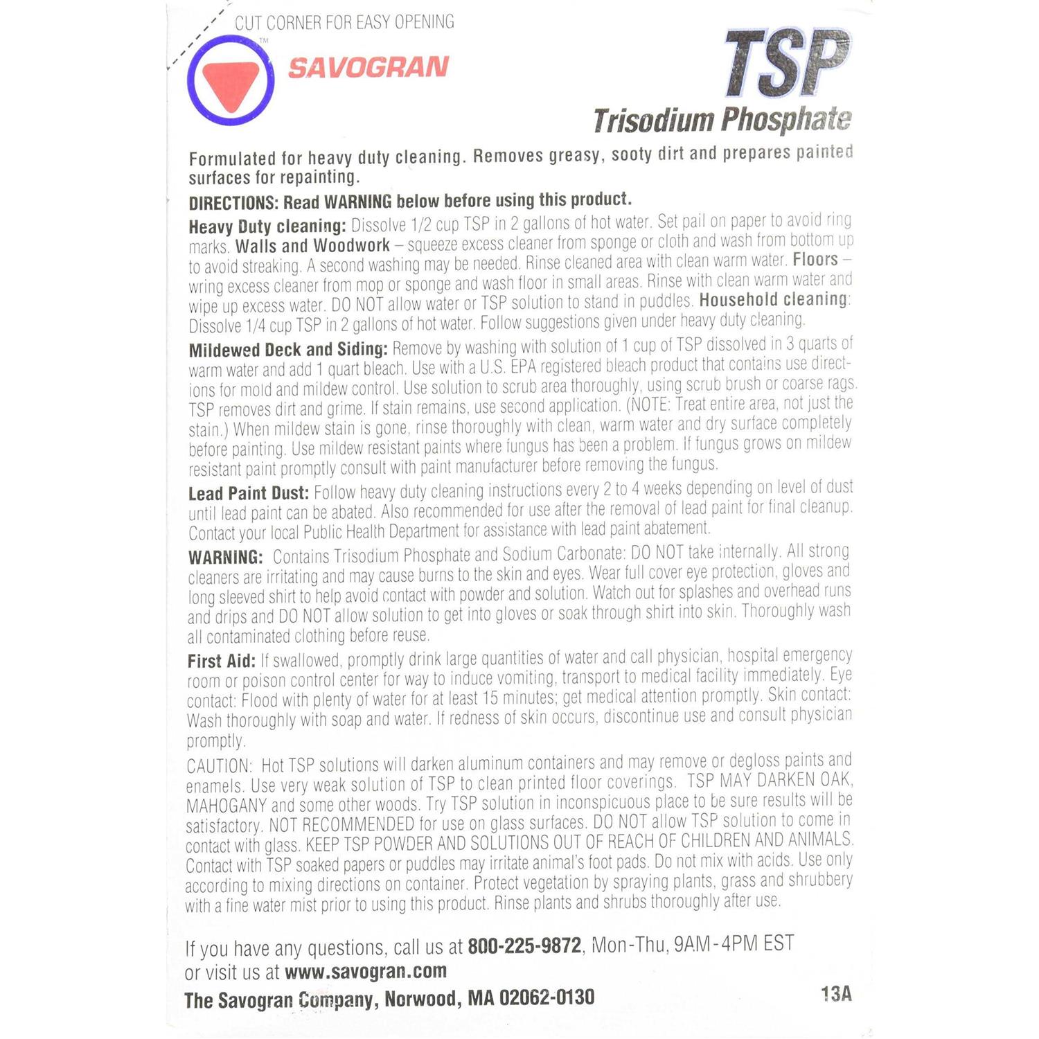 A non-sudsing powdered Trisodium Phosphate compound that is formulated for heavy duty cleaning. Preferred by painting and cleaning professionals for removing heavy deposits of greasy grime, smoke, soot stains and chalked paint from walls, woodwork and floors. Removes mildew and mildew stains when mixed with bleach. Also recommended for washing away paint remover sludge.