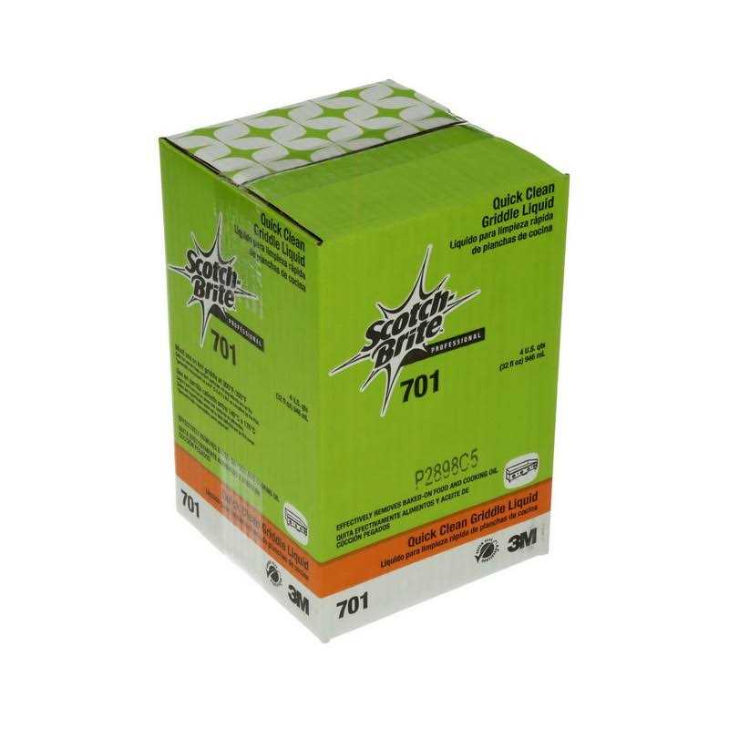 Scotch-Brite Quick Clean Griddle Liquid 701 quickly loosens and lifts stubborn burnt-on food, carbonized grease and food soil upon contact on a hot griddle for easy removal. This powerful, griddle-cleaning liquid is Green Seal certified and safe for use on food-contact surfaces. It offers a simpler, safer system for cleaning up flat top griddles in half the time of traditional cleaning products. Unique, three-step system (squirt, scour, squeegee) cleans commercial griddles in just 3 to 5 minutes while the grill is still hot (300 to 350 Fahrenheit) so you can focus on creating your next culinary masterpiece. Formulation does not have strong chemical odors and does not contain caustic soda found in other griddle cleaning chemicals. Cleaner is made with ingredients that are considered “Generally Recognized as Safe” (GRAS) in food by the U.S. FDA.