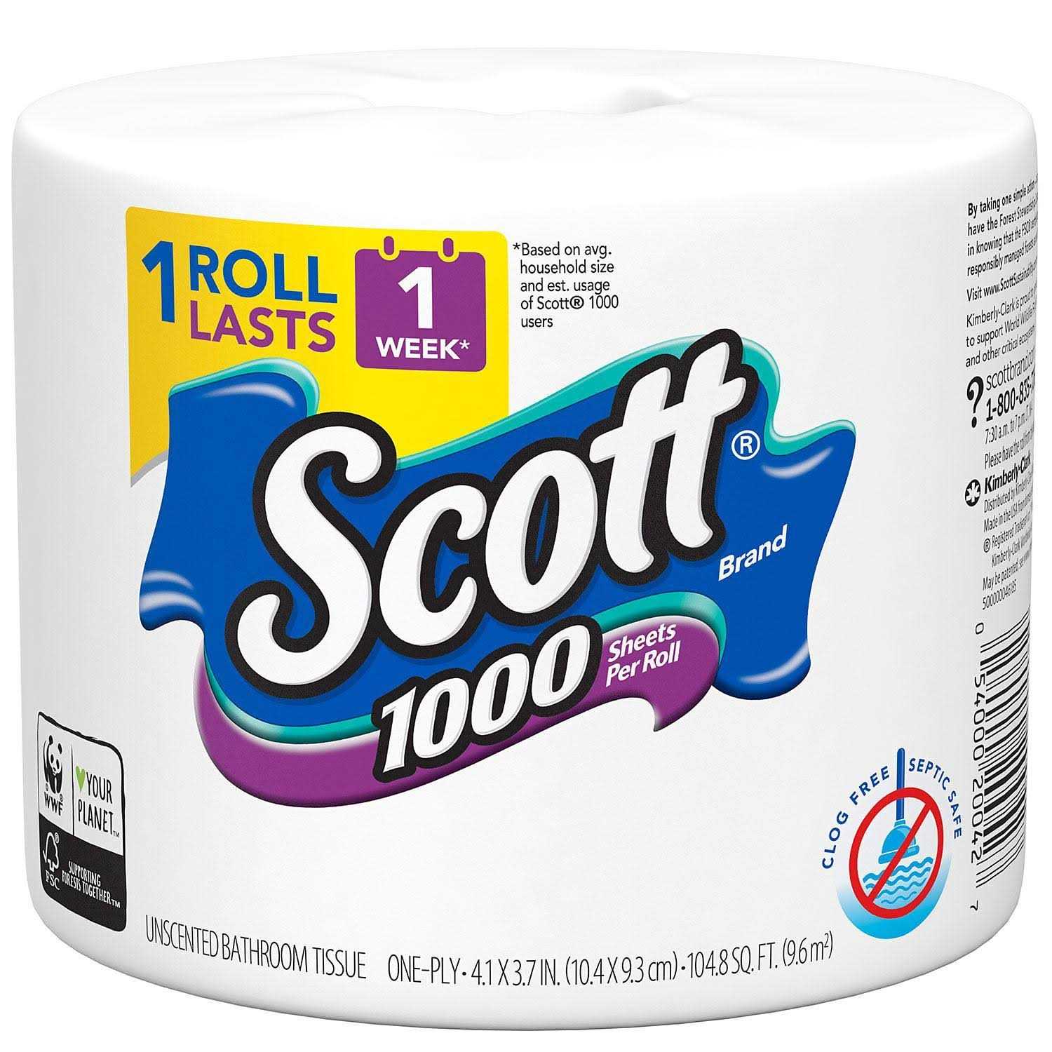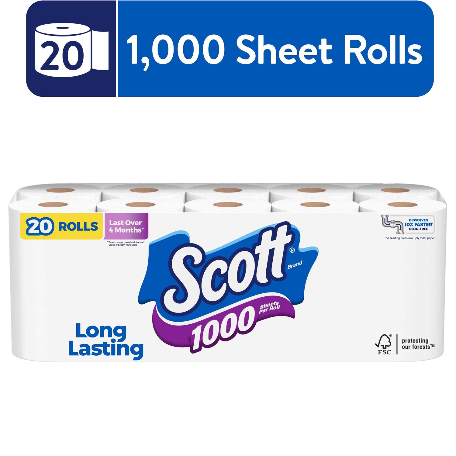 Scott 1000-Sheet Limited Edition Bath Tissue (45 rolls) Scott 1000 Bath Tissue is America’s longest lasting roll, versus national brands’ best-selling roll. You’ll enjoy fewer roll changes and more value for your home. Each toilet paper roll contains 1,000 sheets. Plus, Scott 1000 1-ply bathroom tissue dissolves quickly, so it’s kinder to your plumbing, and safe for sewer and septic systems. You can even use it in your RV or boat. Get the performance you want from a brand you can trust with Scott 1000 Bath Tissue.