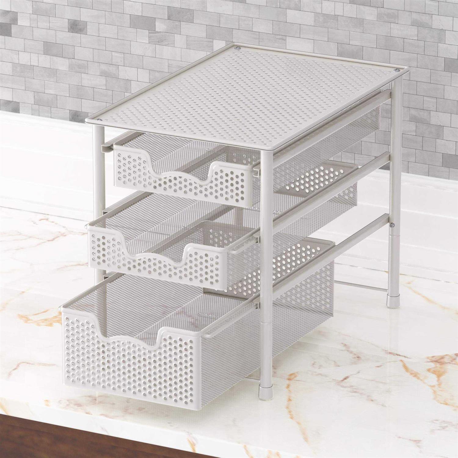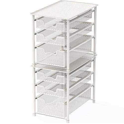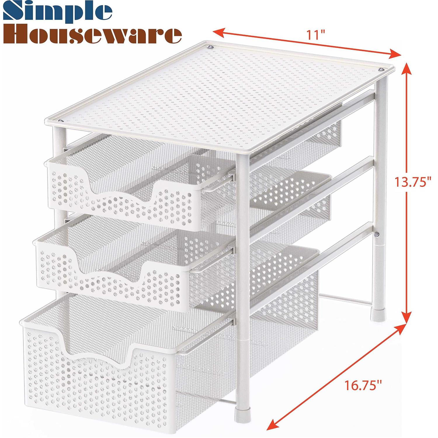 Simple Houseware Stackable 3 Tier Sliding Basket Organizer Drawer, White Organize any cabinet with this convenient sliding basket organizer. Its design makes it perfect for the pantry, under the sink or on your countertop. It has an attractive metal construction and lift-out baskets with easy to carry handles. Stackable Design: Buy two or more and stack them together. Compatible Models of Stacking: CB-001 Series, CB-002 Series, CB-007 Series and CB-008 Series. Sliding basket for easy access in limited space and stackable design (Buy two sets and stack them together). No drill, no power tools needed. Just assemble the baskets and save more space. Two drawers and the top surface hold lots stuff. Great for kitchen, bathroom and storage room organization. Gain more space in the cabinet, pantry room or even open space. Sturdy metal construction with Classic white finish. Dimensions: 16.75”L x 11” W x 13.75” H; Drawer Height: Small: 2.375” (3.15” to the top), Large:4.375” (5.15” to the bottom of small drawer); Drawer Width: 8”.