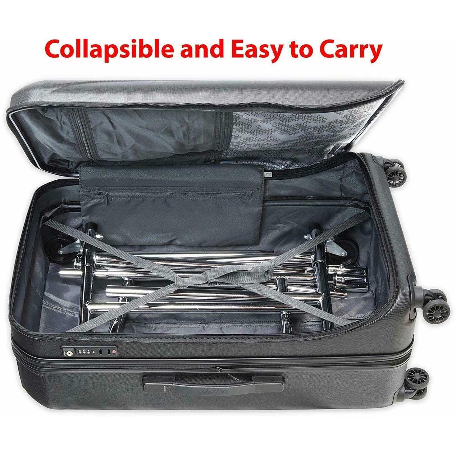 Collapsible Clothing Rack and Easy to Carry. Build with Heavy Duty Steel with Elegant Chrome finish. Comes with Heavy duty 3″ (7.6 cm) Casters/Wheels. Extensible Top Horizontal Rod from 42.5″ to 66.75″ (108 cm to 169.5 cm). Dimensions: 42.5″L x 18″W x 62″H (108 cm L x 45.7 cm W x 157.5 cm H).
