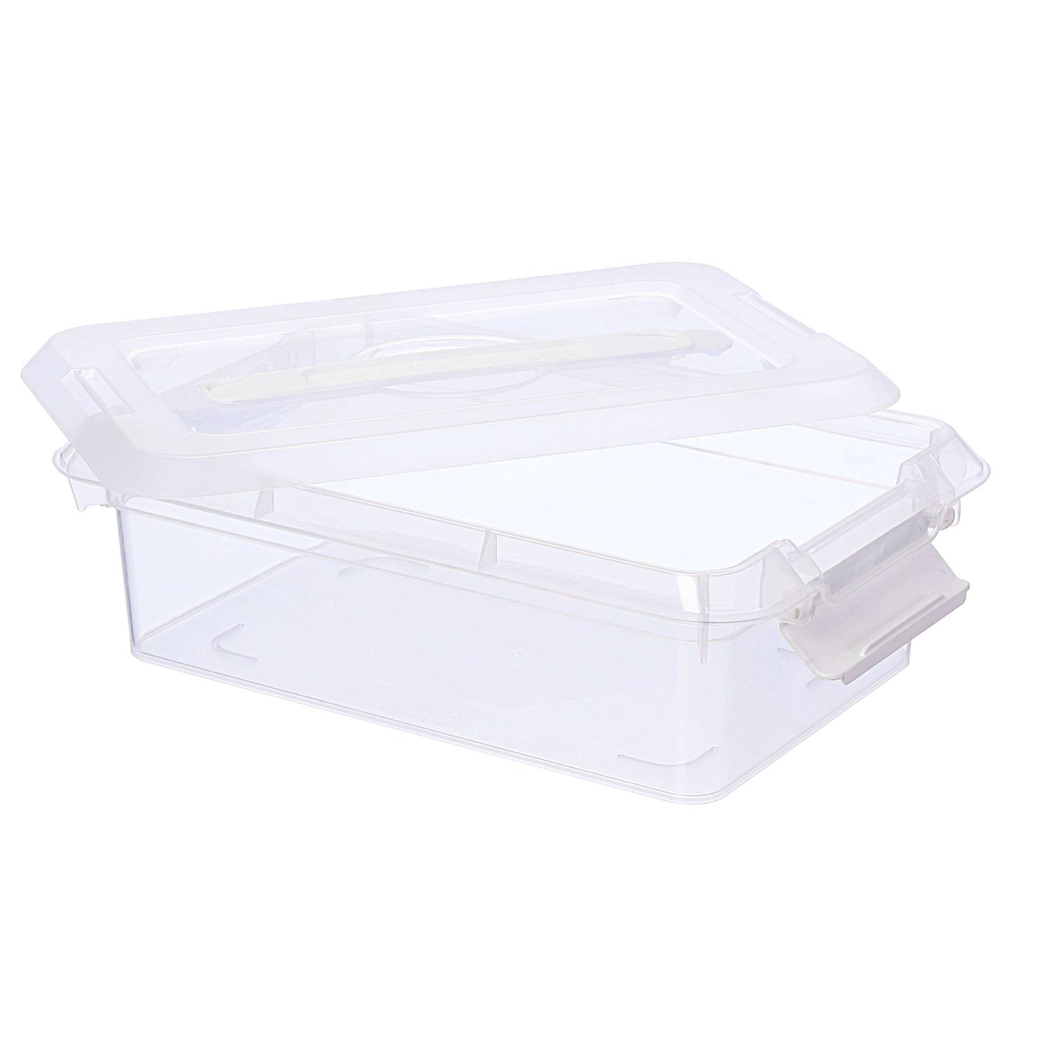 Buy the 3.4qt. This clear storage bin is great for keeping your favorite craft supplies organized. This clear storage bin is great for keeping your favorite craft supplies organized. You can also use it to store household items, knickknacks, files, linens and more. Details: Available in assorted colors of lids 3.4 qt. (3.2 L) 11.6″ x 7.6″ x 3.9″ (29.7cm x 19.5cm x 10cm) Plastic | 3.4qt.