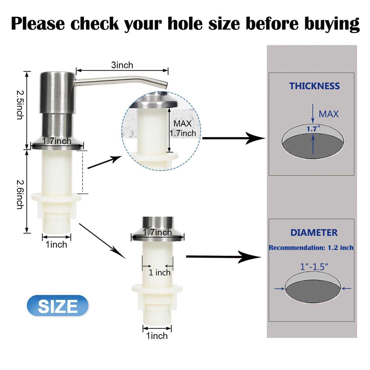 【No Filling Frequently】The built in sink soap dispenser comes with a 47”extension tube kit, so you don’t have to refill the soap into your small bottle too often like you did before. Refill the soap from the big container to the top of pump head without dismantling and no more crawling under the sink! 【Easy to Install】You can easily install our sink soap dispenser in just a few minutes if you can follow the installation guide in the package. Please confirm the hole diameter of the sink before installation, it is suitable for sink hole within 1–1.5 inch.dispensador de jabon de cocina 【MULTIFUNCTIONAL USE】can be filled up with dish soap, hand soap, liquid detergent, or hand lotion. Multipurpose use makes it useful in the kitchen and bathroom. Warm reminder: 1. If the liquid is too thick, it needs to be diluted for better effect. 2. The first time you use it, add a little water to the tube so that the pump head can pump out the liquid more easily. 【High Quality Material】This sink soap dispenser is made of premium 304 stainless steel and PE material. The surface of the pump head is treated with wire drawing, which is elegant and durable, also it is easy to clean. The pump head has passed over 5000 pressing test, so its quality is quite strong and durable.