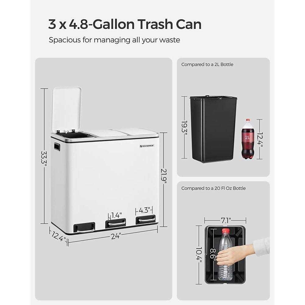 SONGMICS Trash Can 3 x 4.8 Gallon Kitchen Garbage Can 14.4 Gallon Recycle Bin with Soft-Close Lids Pedals and Inner Buckets for Kitchen Stainless