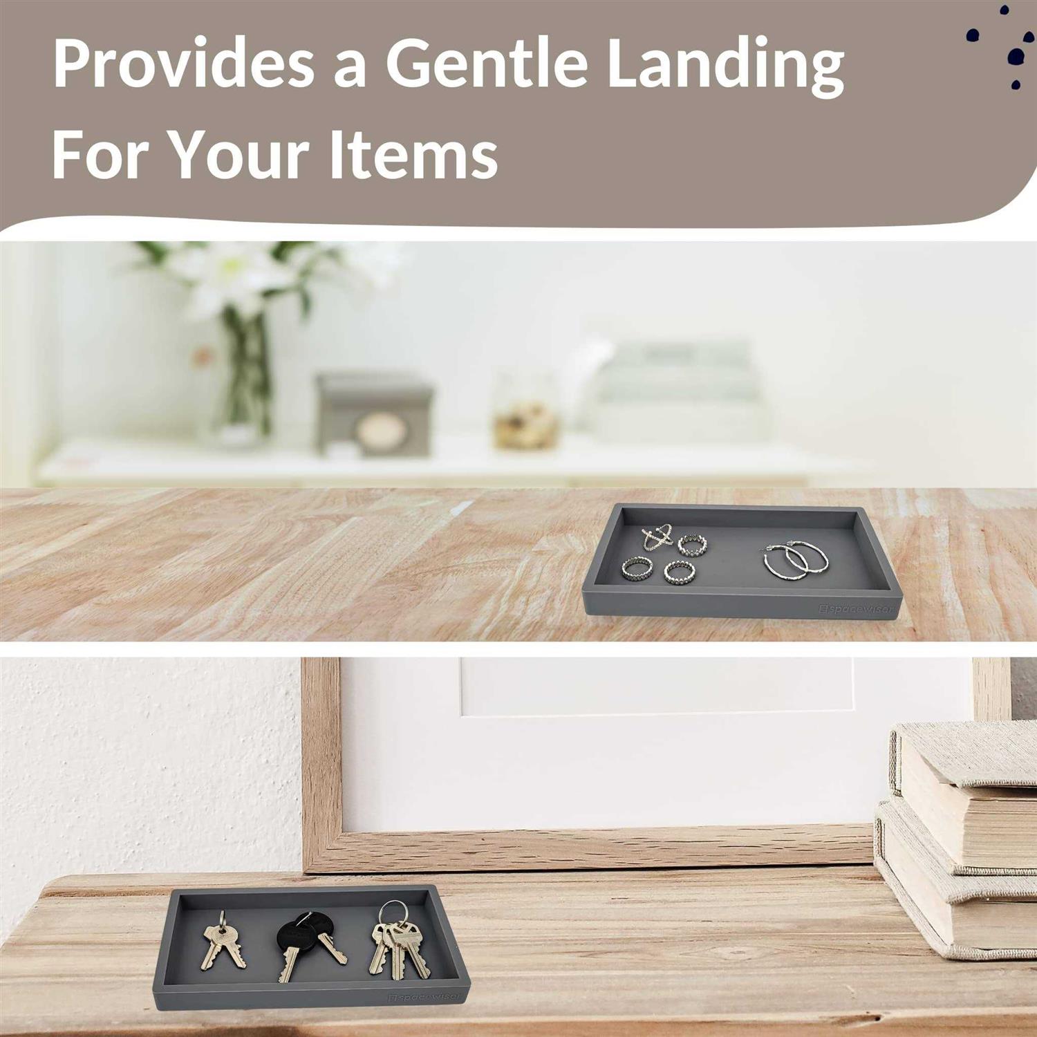Use It Anywhere – Choose the endlessly useful and aesthetically pleasing tray that works anywhere. The Spacewiser Original Silicone Tray is perfect as a bathroom tray, vanity tray or soap dispenser tray. The Details – Sized at 7.7” x 4” and made in colors to complement your home’s color palette. Available in Modern Gray, Latte Tan, or Marble Design (the marble tray is a mixture of light gray and white in a freeform design). Virtually Unbreakable – Relax knowing that unlike trays made of ceramic, resin, or bamboo, this flexible silicone tray is shatterproof- it’s great as a bathroom counter tray or kitchen sink tray for soap bottles. Great for kids’ areas too! Wet Areas, No Problem – This versatile tray is waterproof and won’t warp, discolor or peel. It’s dishwasher safe and excellent as a kitchen soap tray or tray for bathroom countertop areas.