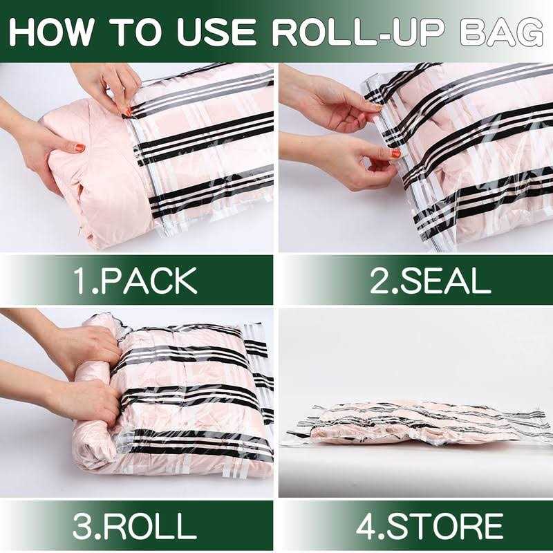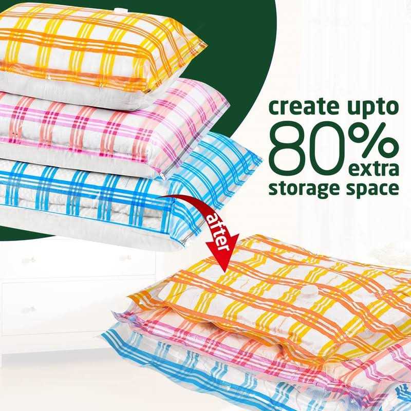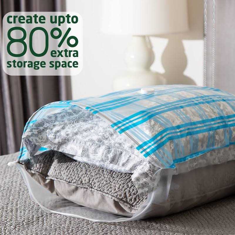 Vacuum Storage Bags offer a perfect storage solution for clothes, with which you can put away your seasonal clothes, comforters and blankets, pillows and more. Easily create 80% more space! Durable Space Saver Bags: extra flexible and thick premium PA&PE (30% thicker than other brands) make these bags ultra durable and re-usable. Secure Vacuum Sealer Bags for clothes: these vacumestoragebags with advanced double-zip and triple-seal valve design to suck every bit of air out and nothing back in. Convenient Space Bags: compatible with any standard vacuum cleaner hose for quick vacuum. A small-sized hand pump is also included, perfect for travel.