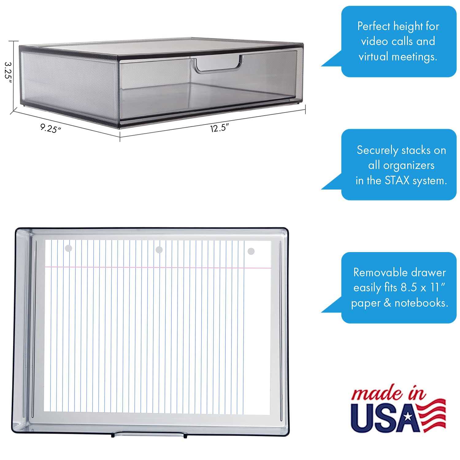 American made with high-quality, durable BPA-free plastic Removable storage drawer holds 8.5″ by 11″ paper, notepads, and rulers Stackable design great for organizing kitchen pantries, vanity cabinets, and office desks Rectangular outer shell with drawer keeps workspace supplies tidy Outer dimensions: 12.5″ W x 9.25″ L x 3.25″ H The STAX system in is the perfect solution for extra storage at any workspace. Keep staplers, notepads, and tape underneath in the spacious drawer. Premium quality plastic in the attractive classic grey color will look great on any desktop. The pull-out storage drawer can fits pencils, scissors, and small notebooks. Easily clean with mild soap and warm water. The textured sides add style to any desktop. Made in USA.