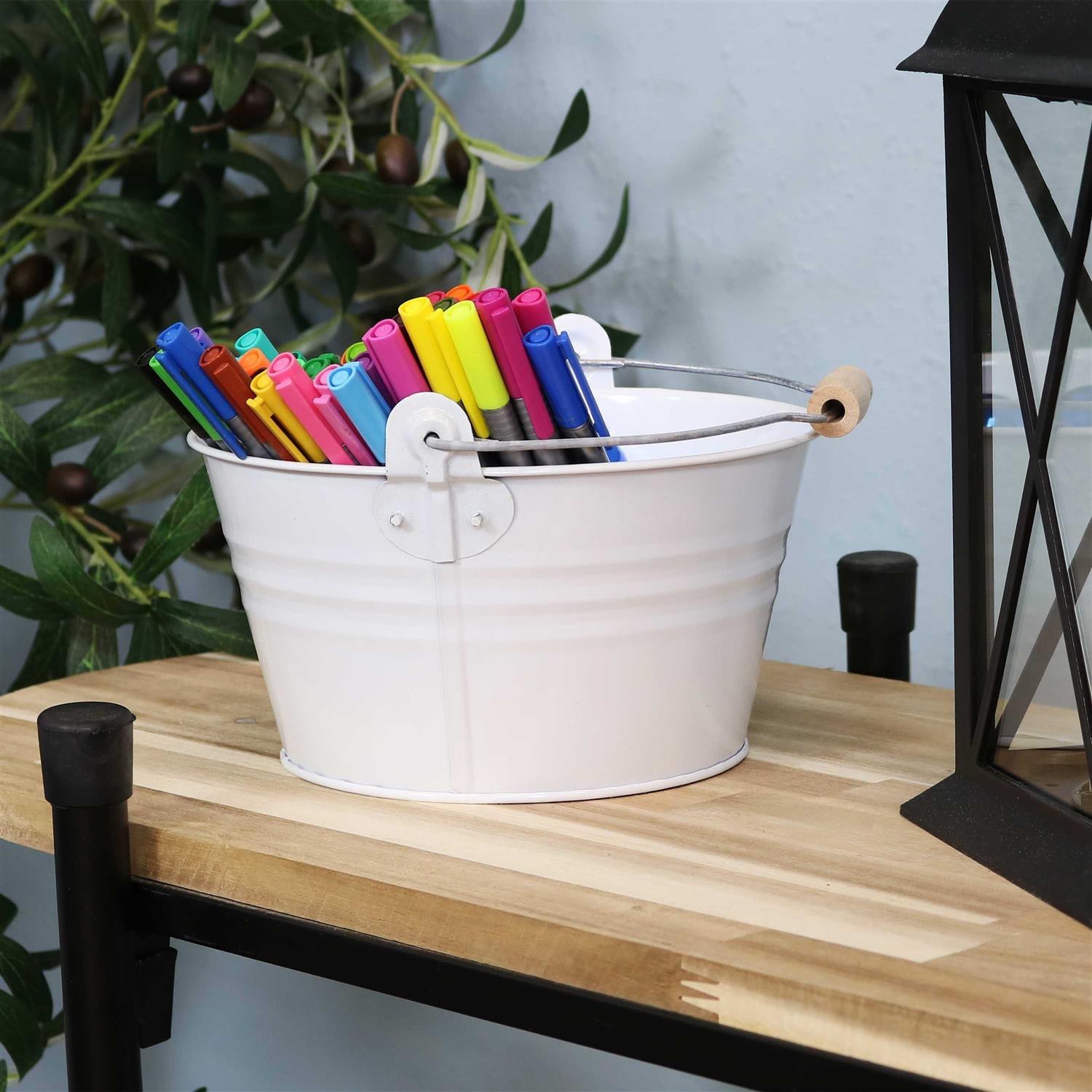 These colorful, galvanized steel buckets with handles are the perfect place for storing odds and ends, decorations, gardening tools, planting succulents, for snack buckets parties, or so much more! These fun metal buckets are made from galvanized steel and feature a convenient handle that makes it easy to carry while staying durable and strong. These pails are perfect for parties and can be used to give kids party favors, as unique table centerpieces, or to serve snacks or candy. They can also be used as adorable storage containers in the bedroom, bathroom, or craft room to keep your space tidy yet stylish. These durable craft buckets are great for storing chalk, markers, pencils, and more. They can even be used to grow flowers indoors as a cute floral planter. The possibilities are endless with these colorful steel buckets! Available in pink, yellow, garnet, white, or teal, these buckets are sure to complement any indoor space or party agenda!