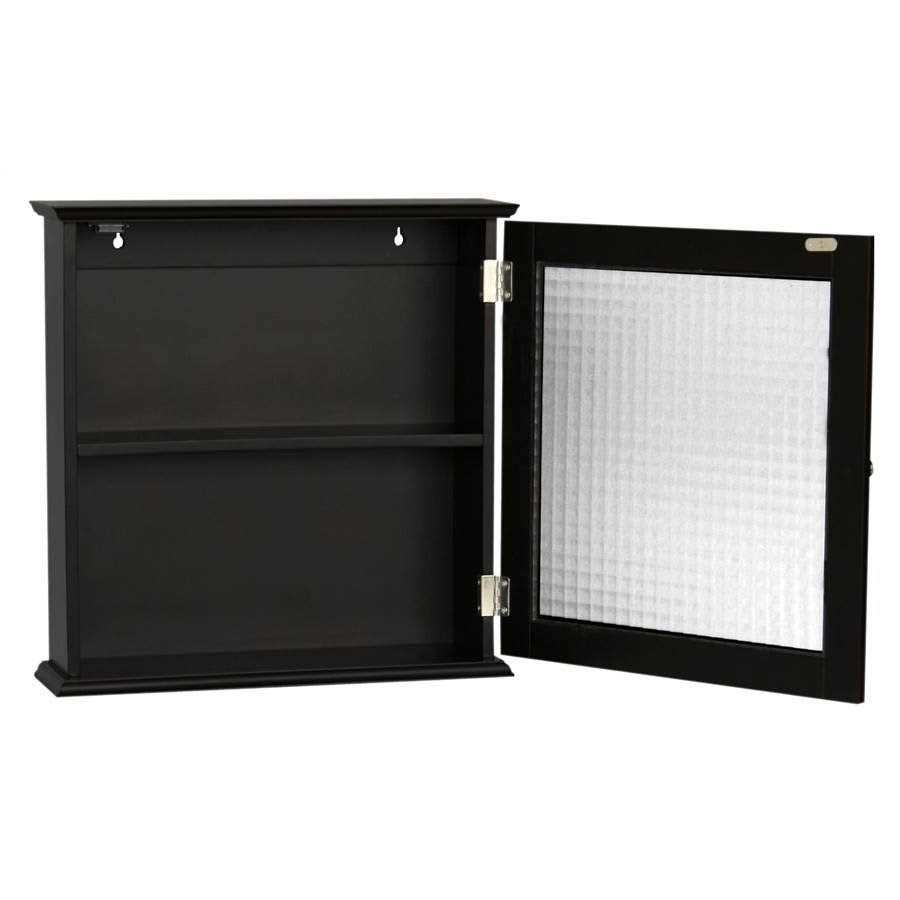 Dimensions: 18.38″ W x 5.5″ D x 18.5″ H. Made of MDF1 large door with waffle glass panels. 1 double-plated handle. Includes 1 shelf. Some assembly required. The Chesterfield Medicine Cabinet 1 Glass Door is an attractive storage addition for any bathroom featuring a glass-paneled door with a waffle pattern and one internal shelf.