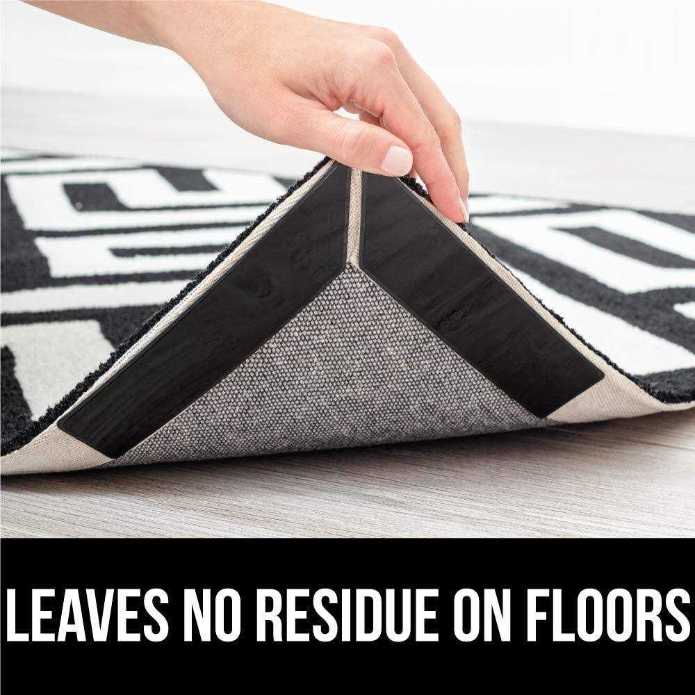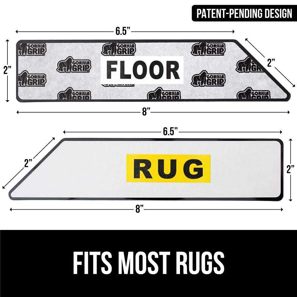 GRIP DESIGN: the original Gorilla Grip grippers for hard floors help to keep your rugs in place and prevent corner and side curling; easy to apply to the underside of rugs and floors to help rugs stay in place and flat against the floor NO CURLING ON CORNERS OR SIDES: innovative design seamlessly attaches to the underside of rug corners to help prevent rugs from curling upwards away from the floor; grippers can be used under the straight sides of rugs as well EXTRA STRONG DUAL SIDED GRIP: dual sided rug grippers stick to both the underside of your rug and the topside of your floor to seamlessly grip rugs to hardwood floor; works on most hard floors REMOVABLE AND REUSABLE: removable and reusable rug grippers can be used time and time again; to reuse, simply wipe with a damp cloth and reapply to floor when dry; grippers leave no residue on floors LOW PROFILE, FLEXIBLE AND CONVENIENT SIZE: our unique thin and low-profile design is flexible and soft underfoot, gripper measures 8 inches by 6.5 inches, by 2 inches WILL THIS REALLY HELP TO KEEP MY RUGS FROM CURLING? Yes! Our rug corner grippers are designed to help keep rugs in place and prevent corner curling. They have a strong, two-sided grip that attaches seamlessly to the underside of your rug and the topside of your floor. HOW DO I APPLY THE GRIPPERS? To use, simply peel and stick to your rug bottom and floor and press the rug down firmly. /! \ WARNING: To Prevent Falls: Place on clean, dry floor and smooth wrinkles. Make sure rug lies flat and stays flat with use. Do not use on stairs. Before using, test with foot to ensure it doesn’t move. WILL THEY BE VISIBLE UNDER MY CARPET? No! The grippers measure only 1.12mm and stay hidden under rugs. WILL THESE LOSE THEIR STICKINESS OVER TIME? The grippers were designed for long-lasting use. To reuse and renew the stickiness of the grippers, simply wipe down with a damp cloth and reapply when dry. Your grippers will be good as new. WHERE CAN I PLACE THE GRIPPERS? Our grippers have a unique design that allows for seamless placement on the corners of rugs, or on the sides of rugs, so you can help prevent curling and bunching anywhere! <