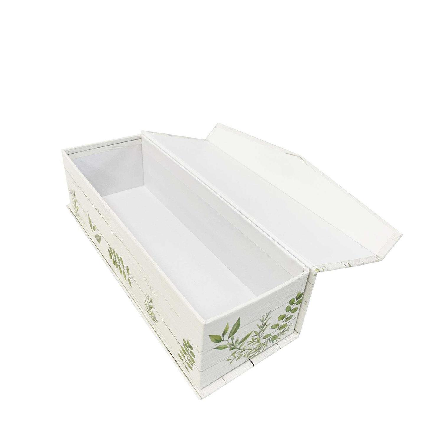 DECORATIVE DECOR Store items in plain sight with lidded storage boxes that add elegance to any room NESTING BOXES These attractive boxes fit inside one another so you can easily store them when not in use THREE SIZES Three convenient sizes to store fabric, clothes, ornaments, photos, and other memories TEST OF TIME Our lidded boxes are made from durable paperboard to withstand many seasons to come DESIGNED WITH CARE Decorated with an elegant print and inspirational messages that adorn the outside of each box, expressing love and gratitude wherever you keep them BLESSED Now you can keep your most precious possessions in this set of three attractive magnetic tab boxes. Show your unique style and taste when you display these decorative treasure chests with inspirational sayings – the perfect place to store your most beloved memories. CHERISHED KEEPSAKES Somehow things seem more special when they’re kept in a special place, and your most cherished possessions deserve a special home. Store precious memorabilia like photos, letters, and other beloved mementos, or you can keep your practical belongings like recipes, fabric swatches, arts & crafts materials, ribbons and yarn. STYLE AND PANACHE Don’t just fill these convenient storage boxes and throw them in the back of a closet. These elegant treasure chests are meant to be seen. You can leave them on display in a living room, bathroom, or bedroom – anywhere you want to impress your guests and give yourself a lift with a little style. DESIGNED WITH CARE These beautiful rectangular containers are designed with care and thoughtfulness that make them exceptional for any décor. Each is decorated with a floral print with cursive lettering. Inspirational messages adorn the outside of each box, expressing faith and gratitude wherever you keep them. An easy way to add elegance to any room. TEST OF TIME These lidded boxes are made of durable paperboard to withstand the test of time. Attractive rectangular containers for storage and organization come in three convenient sizes to store fabric, clothes, ornaments, photos, and other memories. Boxes nest inside one another so you can easily store them when not in use. A magnet holds the front tab of the hinged lid to the front of the box to secure it closed. DIMENSIONS Large – 11.75” x 5.25” x 4.5” Medium – 11” x 4.5” x 3.5” Small – 10.25” x 3.5” x 2.75”