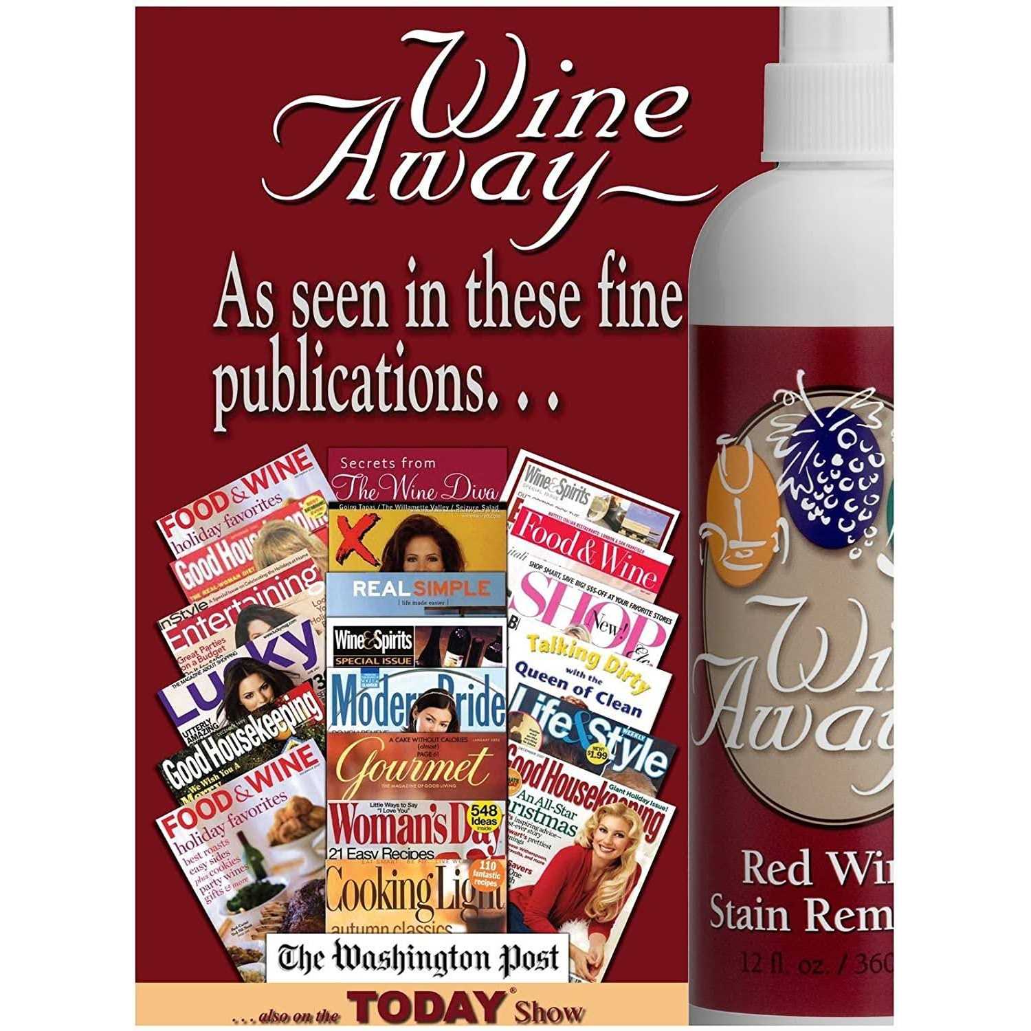 Wine Away is a remarkable red wine stain remover formulated to remove most red wine stains from carpet and fabric. It is made from fruit and vegetable extracts, has a fresh citrus scent and contains no bleach. Wine Away is safe to use around children and pets. It is nonflammable, biodegradable and contains no phosphates. Note: Some stains vanish immediately, others may require laundering.