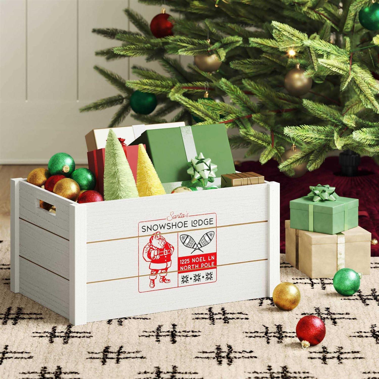 Get a convenient spot to store and organize your decorative items with the Wood ‘Santa’s Snowshoe Lodge’ Decorative Storage Bin from Wondershop . This white storage bin features the text “Santa’s Snowshoe Lodge,” and “1225 Noel LN North Pole” along with an image of Santa and snowflakes for a festive look. Made with wood, this rectangular bin comes with an open top and offers ample storage space, and it’s designed with side cutout handles for easy lifting. Welcome to the Wondershop .